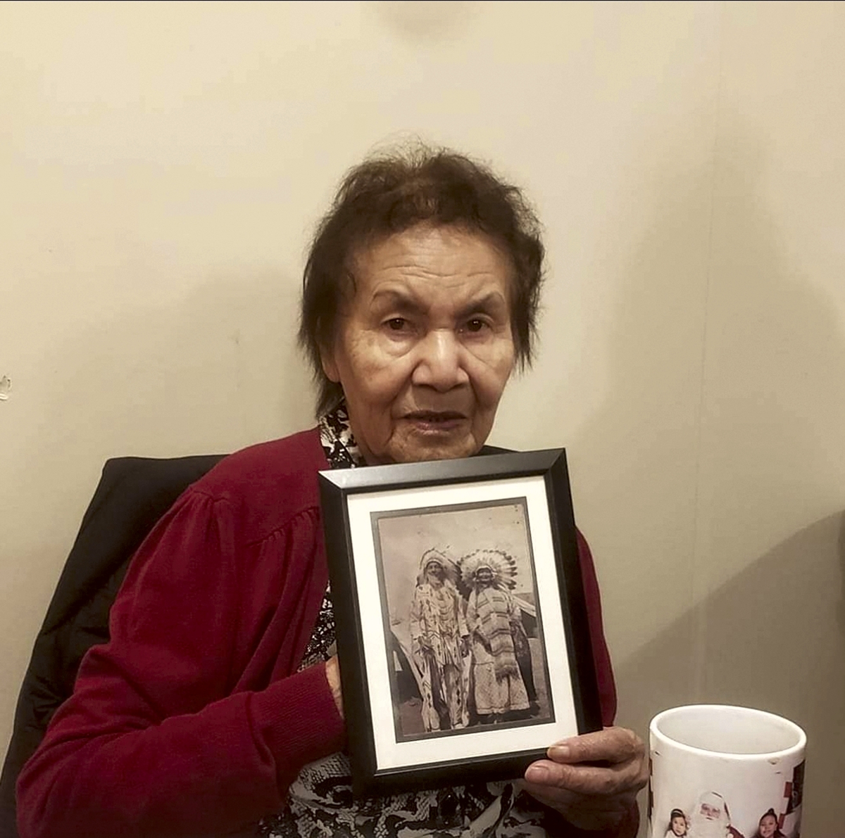 Benjoe’s mother Yvonne is a Residential School survivor, as were her parents and grandparents. She holds a photo of her grandparents, Bob Obey and Mary Emily, who helped raise her.