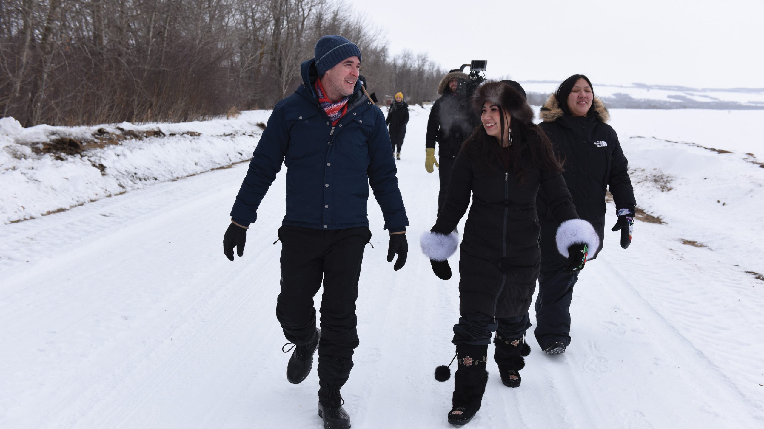 “Treaty Road” hosts Saxon de Cocq and Erin Goodpipe with director Candy Fox on location. Photo: 3 Story Pictures