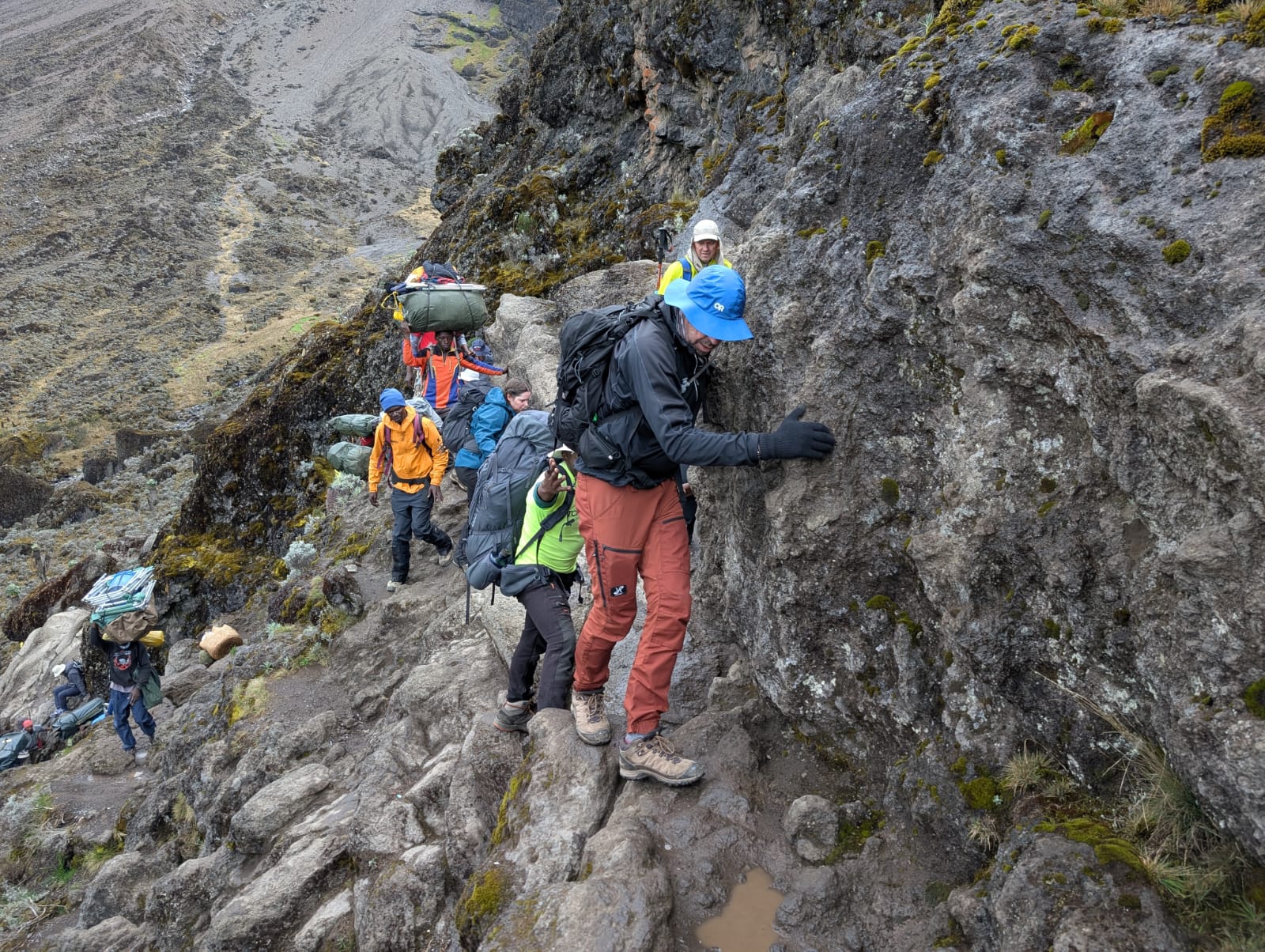 The author navigates the Barranco Wall, or Death Wall as it’s sometimes known. Hikers on the Lemosho Route scramble up the 250-metre wall on day five of an eight day trek.