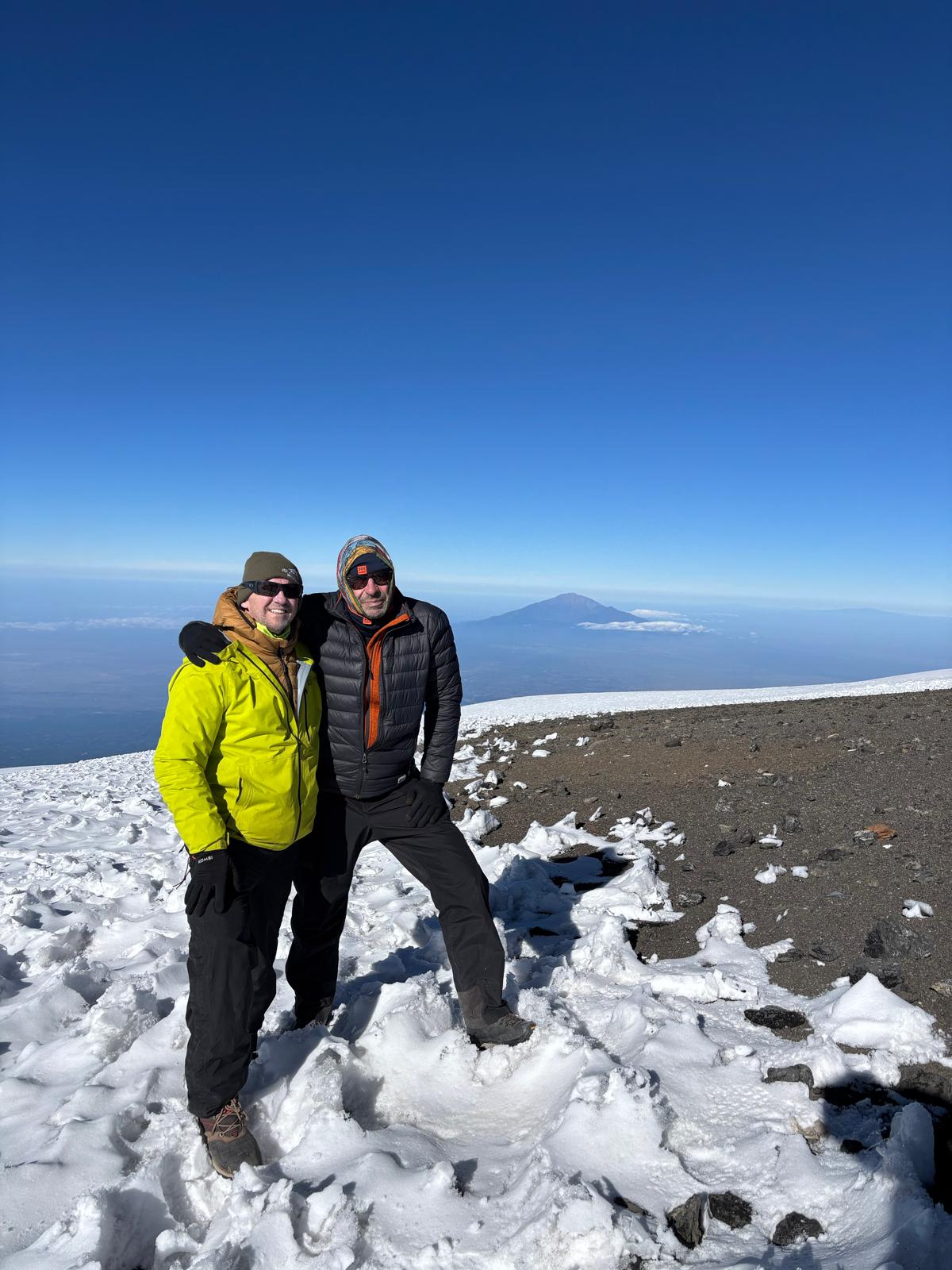 Asselin and Campbell pose for a photo near the summit of Kilimanjaro. Mount Meru, another dormant volcano, can be seen in the distance.