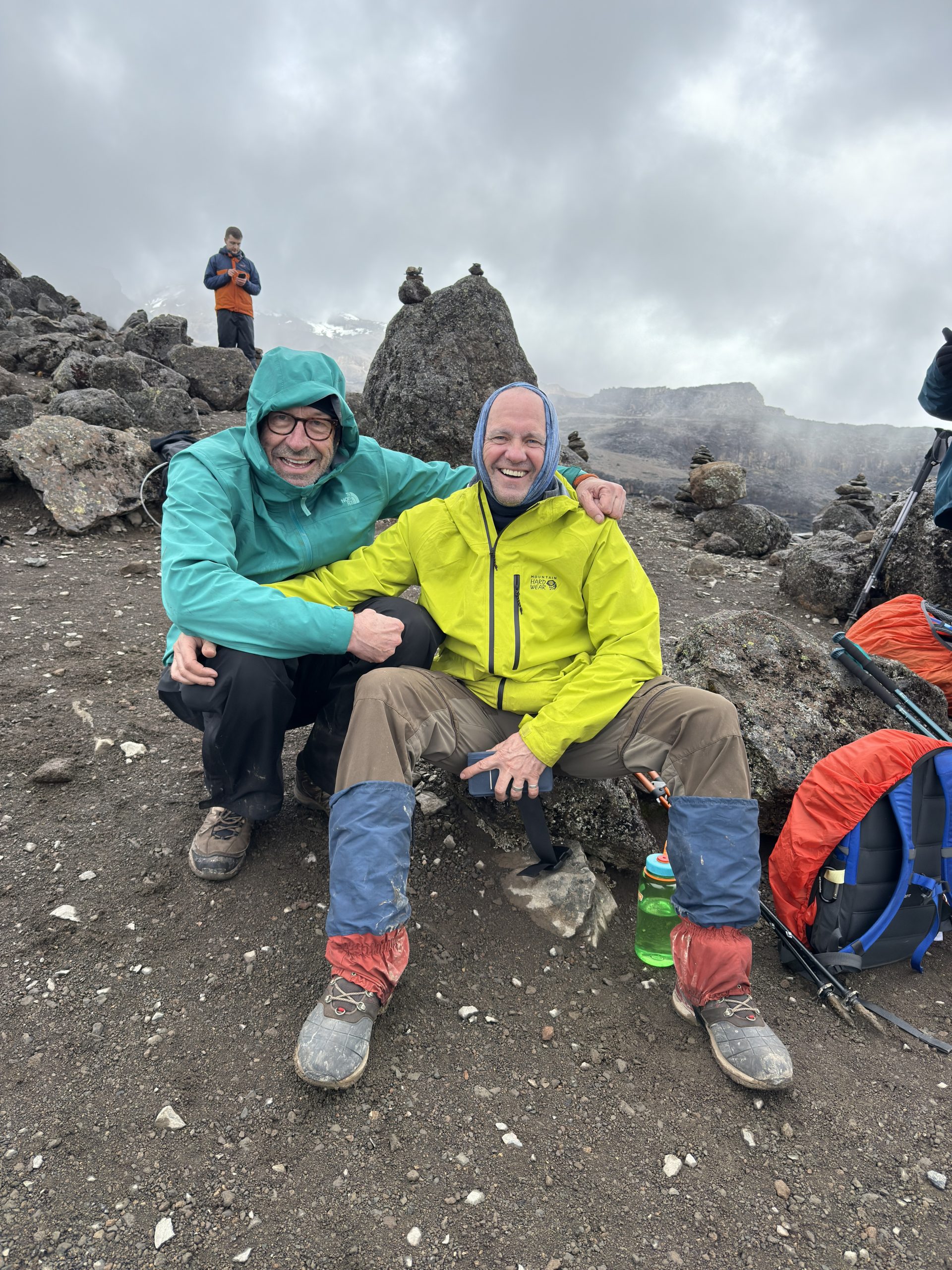 Campbell and Asselin share a laugh during the last days of their Kilimanjaro climb in March.