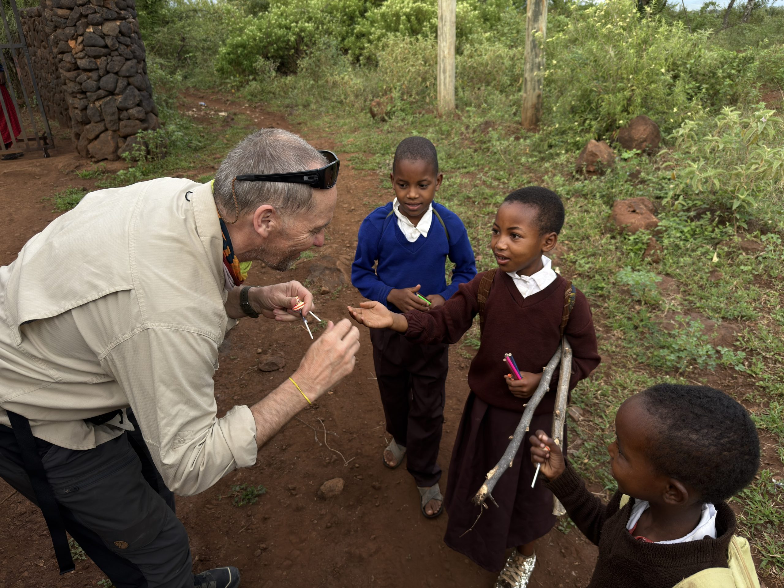 Asselin hands out treats and school supplies during his visit to Tanzania to climb Mount Kilimanjaro.
